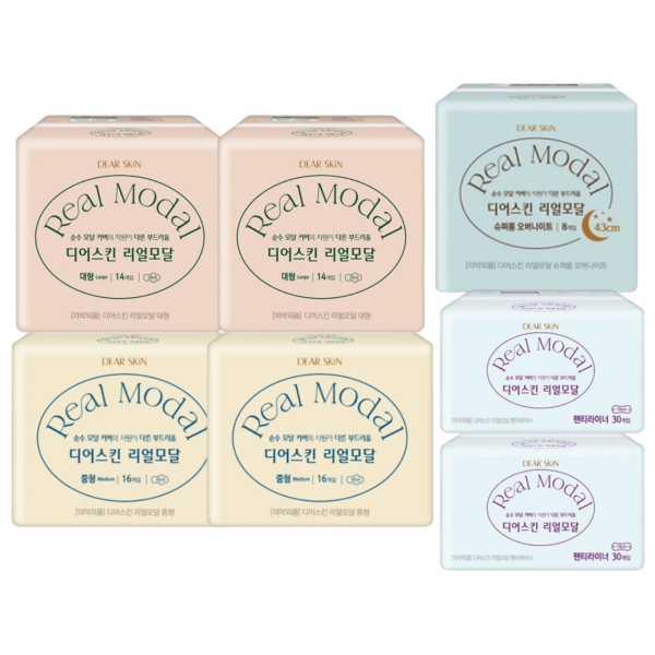 디어스킨 리얼모달 중형(16P) 2팩+대형(14P) 2팩+오버나이트(8P) 1팩+팬티라이너(30P) 2팩