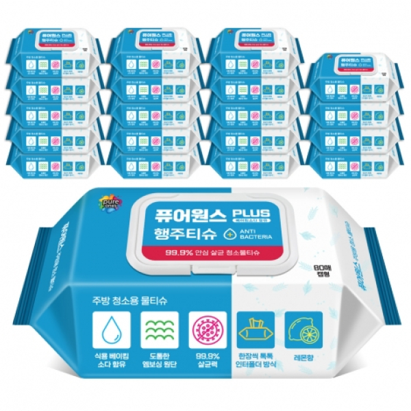 [퓨어원스+]홈케어 청소 살균물티슈 주방용 80매x20팩(캡형)