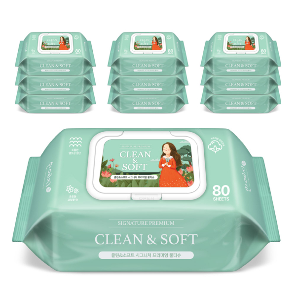 한예지 클린앤소프트 시그니처 프리미엄 고평량 엠보 물티슈 캡형 80매 10팩 "60 gsm