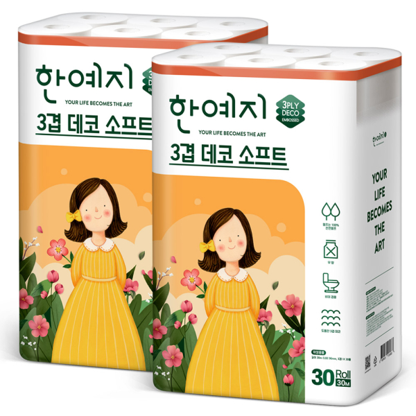 한예지 30롤 30m 3겹 데코 소프트 무형광 천연펄프 화장지 2팩