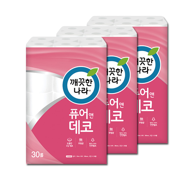 [깨끗한나라] 화장지 3겹 퓨어앤데코 30m 30롤 3팩